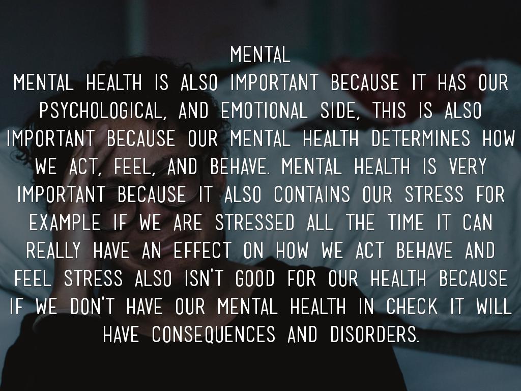 Mental Mental health is also important because it has our psychological, and emotional side, this is also important because our mental health determines how we act, feel, and behave. Mental health is very important because it also contains our stress for example if we are stressed all the time it can really have an effect on how we act behave and feel stress also isn't good for our health because if we don't have our mental health in check it will have consequences and disorders.