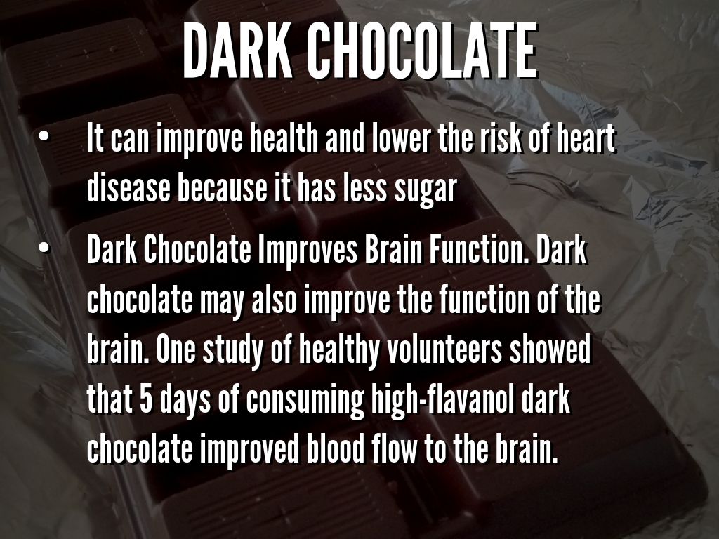 Dark Chocolate Improves Brain Function. Dark chocolate may also improve the function of the brain. One study of healthy volunteers showed that 5 days of consuming high-flavanol dark chocolate improved blood flow to the brain.