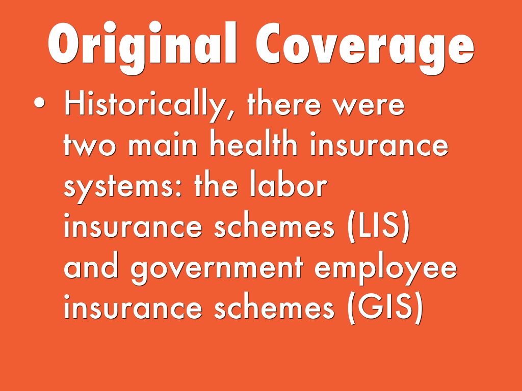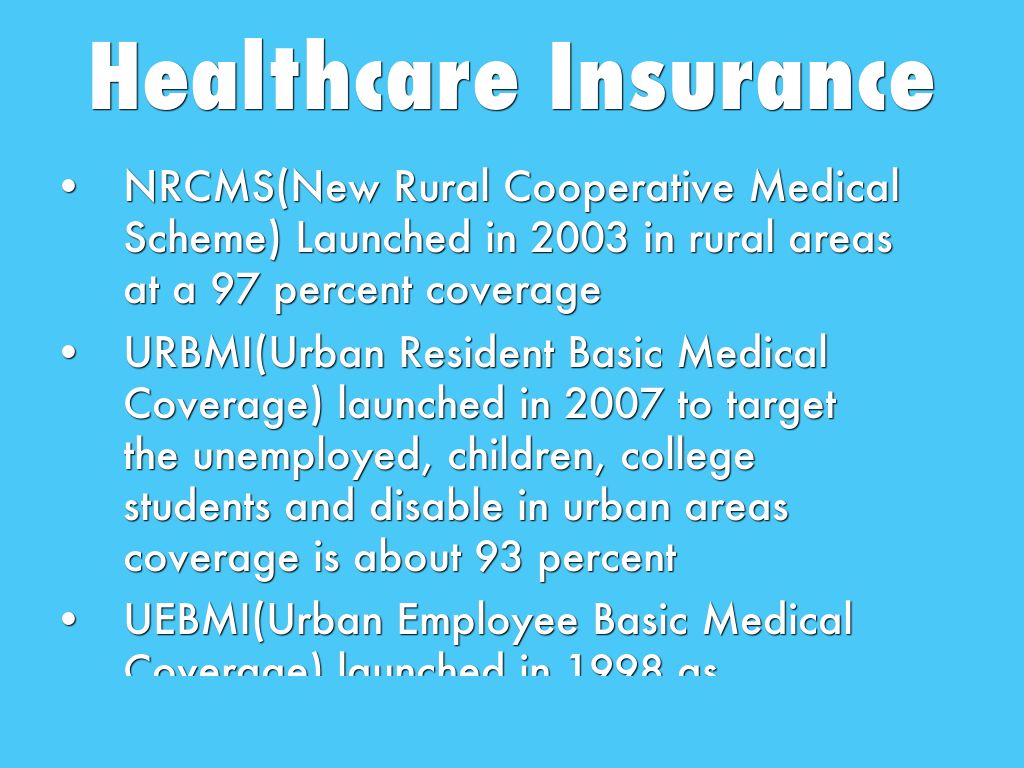 URBMI(Urban Resident Basic Medical Coverage) launched in 2007 to target the unemployed, children, college students and disable in urban areas coverage is about 93 percent