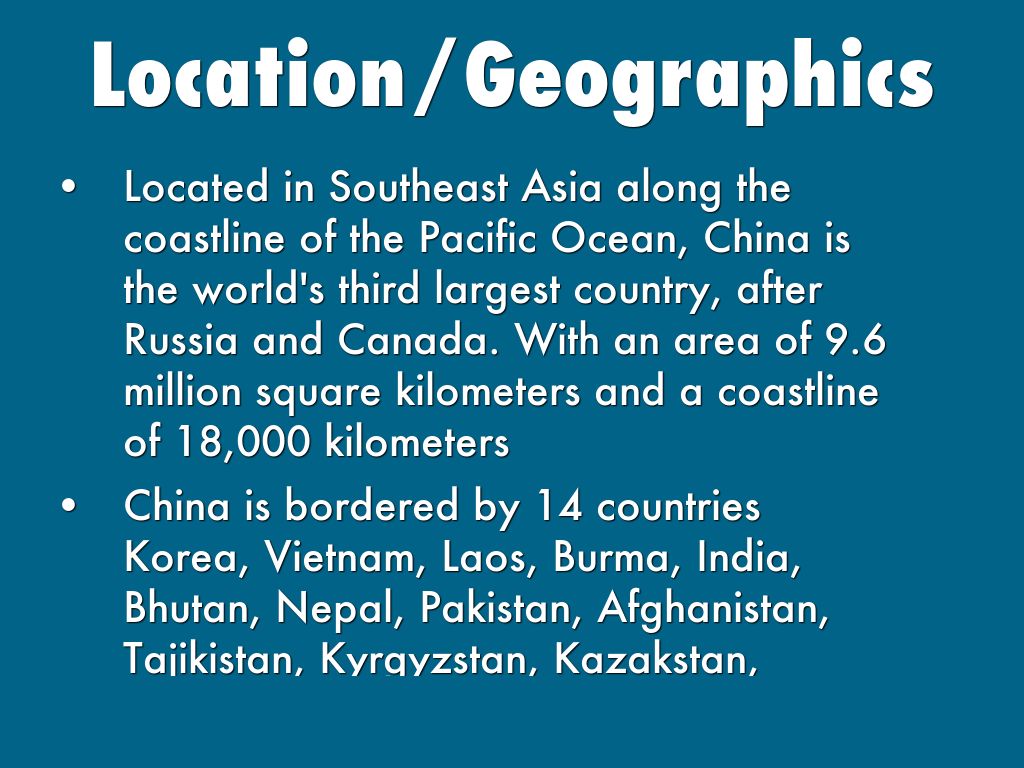 Located in Southeast Asia along the coastline of the Pacific Ocean, China is the world's third largest country, after Russia and Canada. With an area of 9.6 million square kilometers and a coastline of 18,000 kilometers
