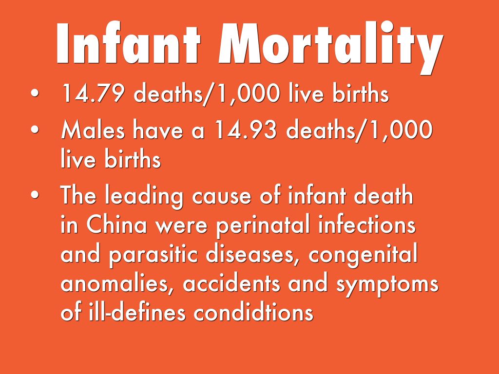The leading cause of infant death in China were perinatal infections and parasitic diseases, congenital anomalies, accidents and symptoms of ill-defines condidtions