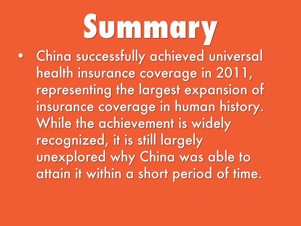 China successfully achieved universal health insurance coverage in 2011, representing the largest expansion of insurance coverage in human history. While the achievement is widely recognized, it is still largely unexplored why China was able to attain it within a short period of time.