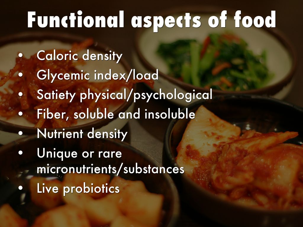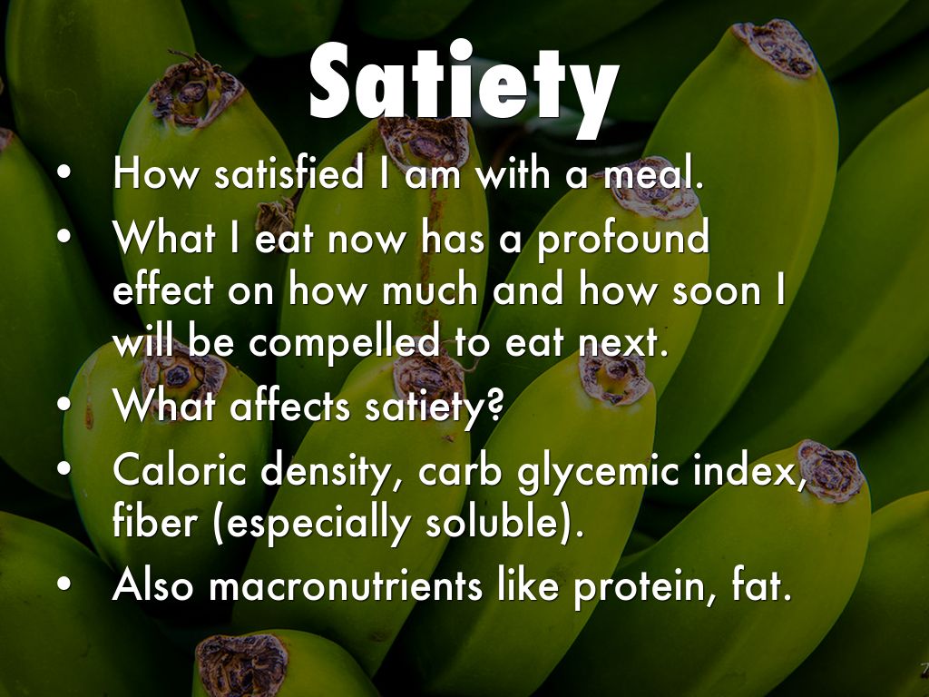 - Caloric density, carb glycemic index, fiber (especially soluble).