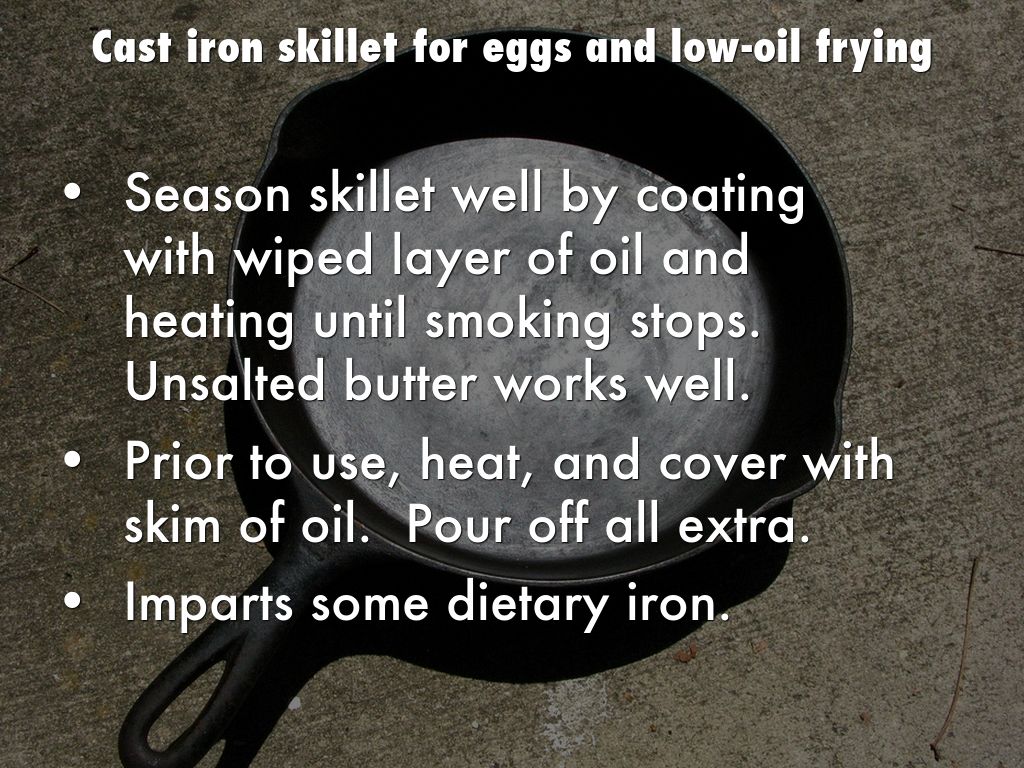 - Season skillet well by coating with wiped layer of oil and heating until smoking stops. Unsalted butter works well.