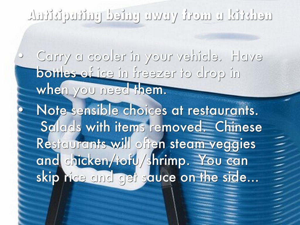 - Carry a cooler in your vehicle. Have bottles of ice in freezer to drop in when you need them.