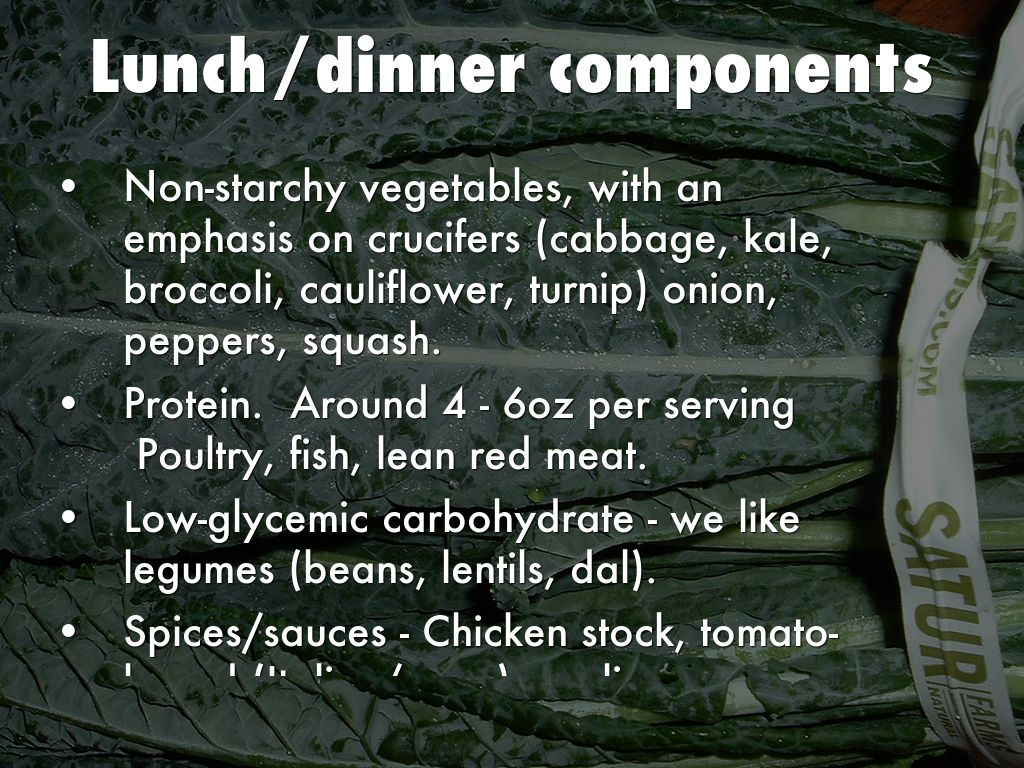 - Non-starchy vegetables, with an emphasis on crucifers (cabbage, kale, broccoli, cauliflower, turnip) onion, peppers, squash.