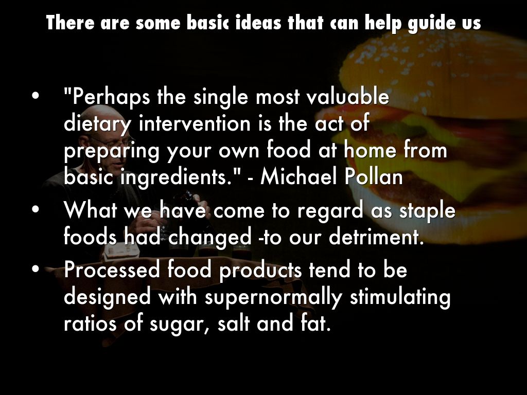 - "Perhaps the single most valuable dietary intervention is the act of preparing your own food at home from basic ingredients." - Michael Pollan