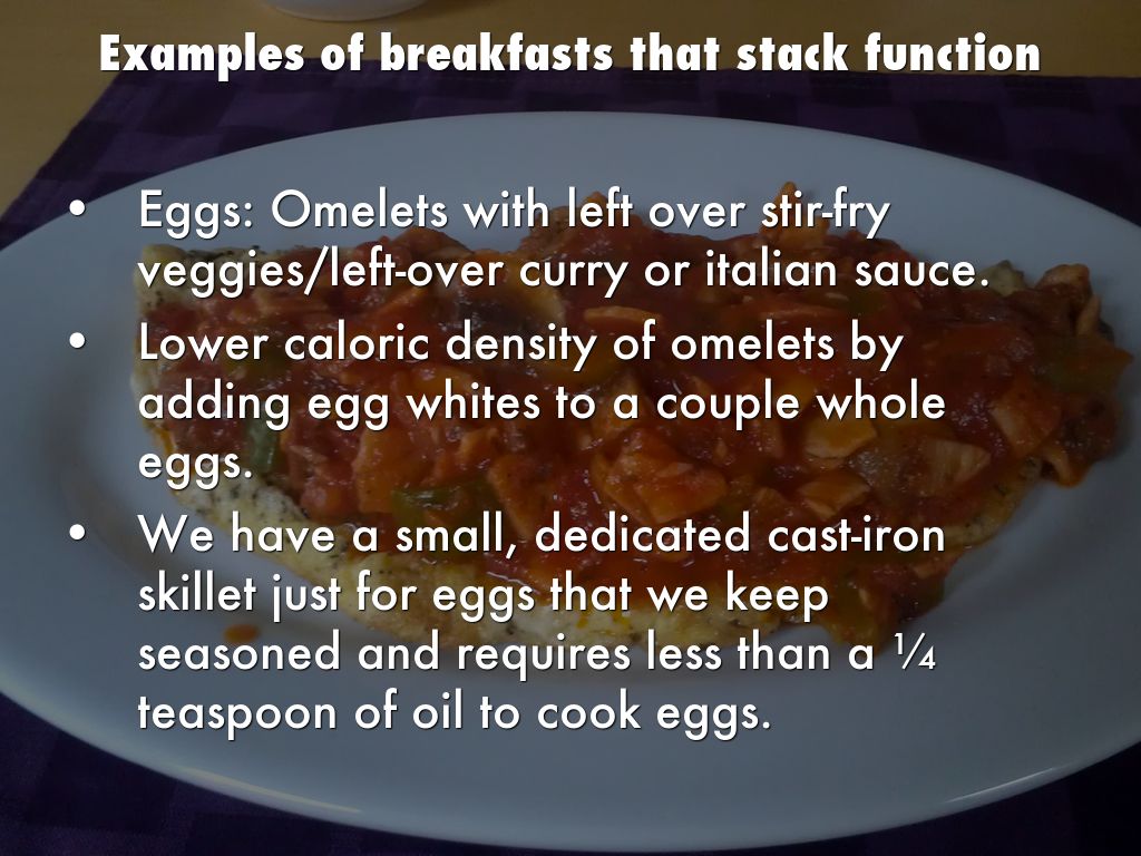 - Eggs: Omelets with left over stir-fry veggies/left-over curry or italian sauce.