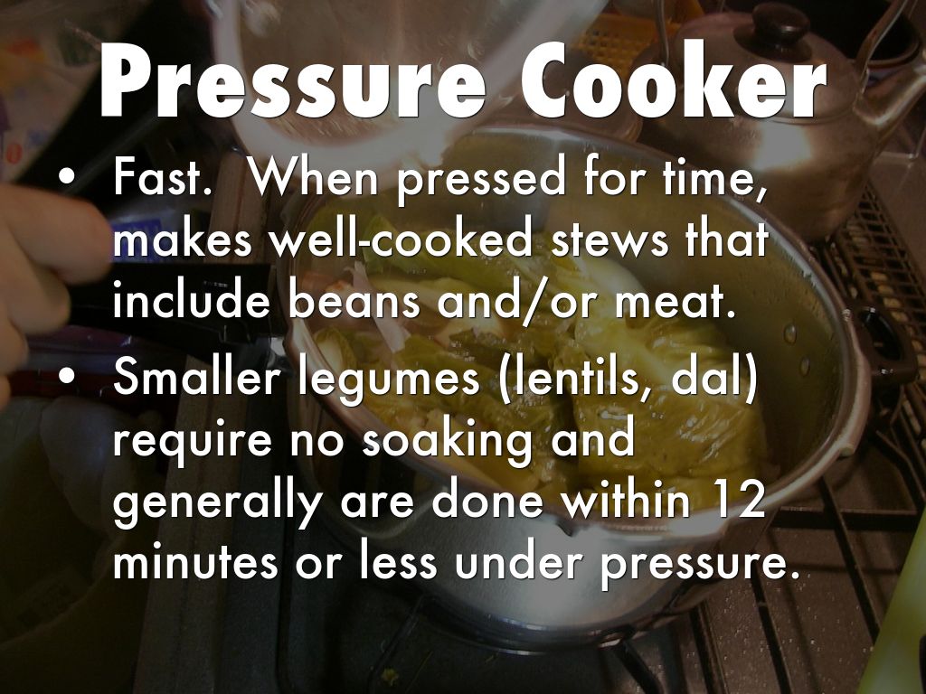 - Smaller legumes (lentils, dal) require no soaking and generally are done within 12 minutes or less under pressure.