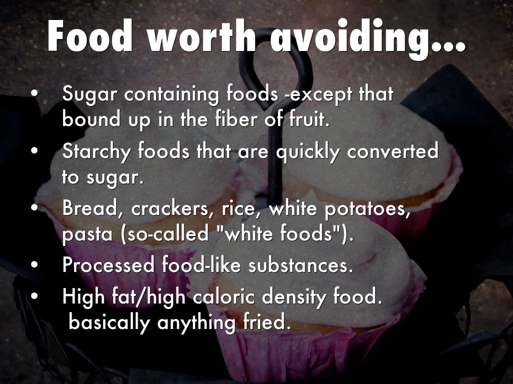 - Bread, crackers, rice, white potatoes, pasta (so-called "white foods").