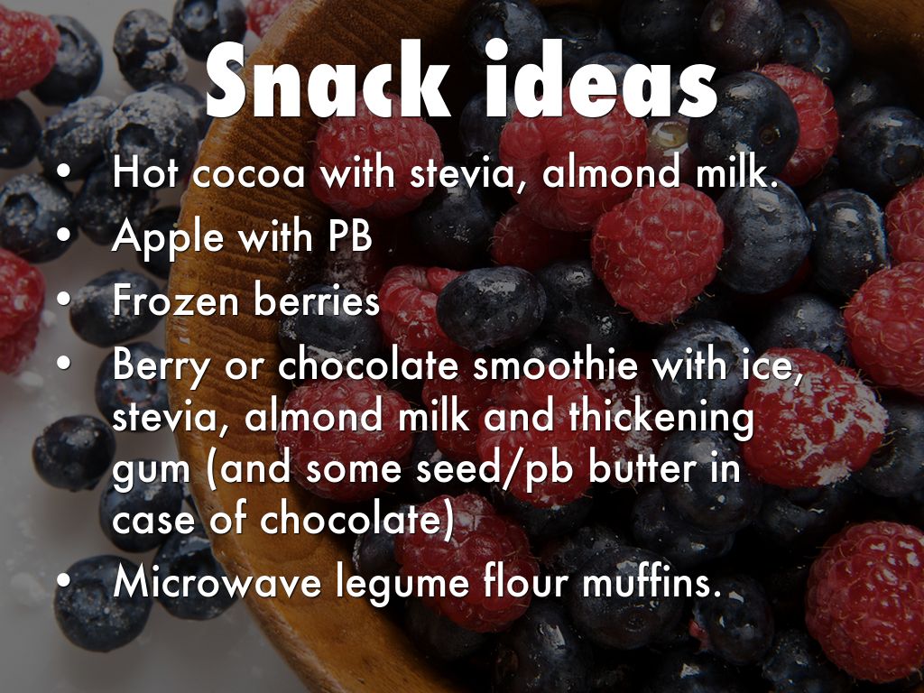 - Berry or chocolate smoothie with ice, stevia, almond milk and thickening gum (and some seed/pb butter in case of chocolate)