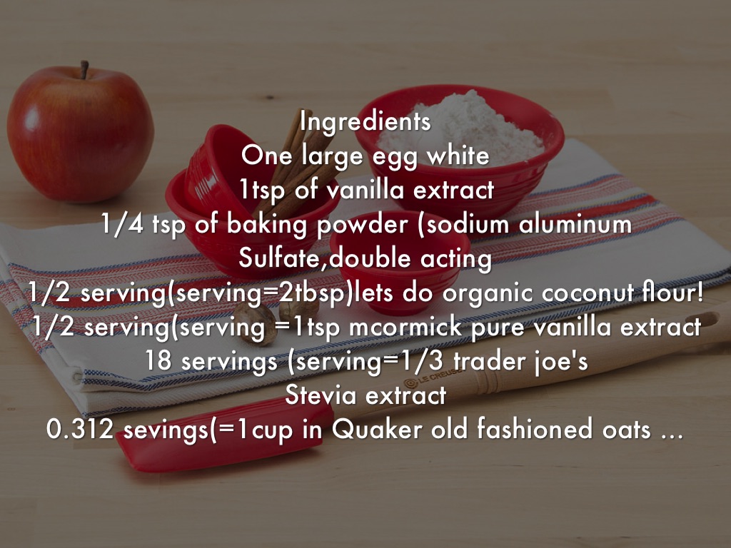Ingredients One large egg white 1tsp of vanilla extract 1/4 tsp of baking powder (sodium aluminum Sulfate,double acting 1/2 serving(serving=2tbsp)lets do organic coconut flour! 1/2 serving(serving =1tsp mcormick pure vanilla extract 18 servings (serving=1/3 trader joe's Stevia extract 0.312 sevings(=1cup in Quaker old fashioned oats 2 sevings (sevings =1packet )sugar in the raw stevia in the raw(packet