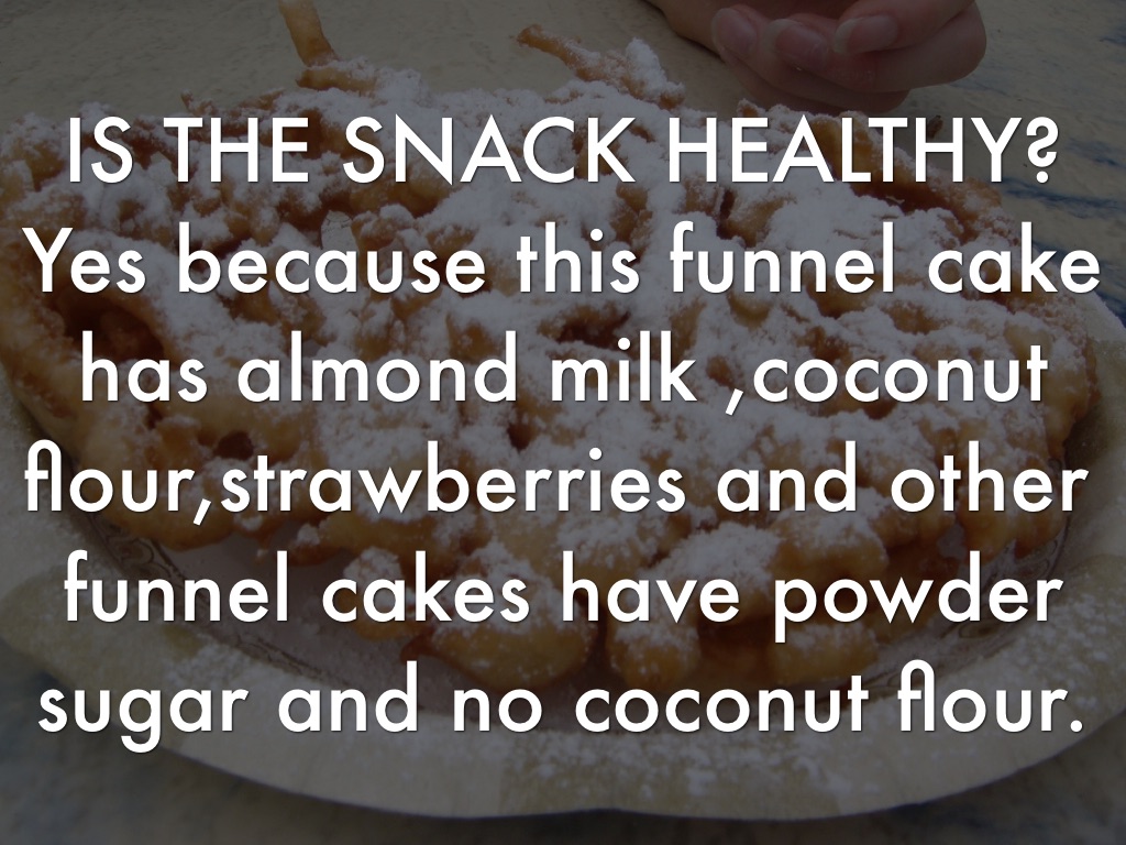 IS THE SNACK HEALTHY? Yes because this funnel cake has almond milk ,coconut flour,strawberries and other funnel cakes have powder sugar and no coconut flour.