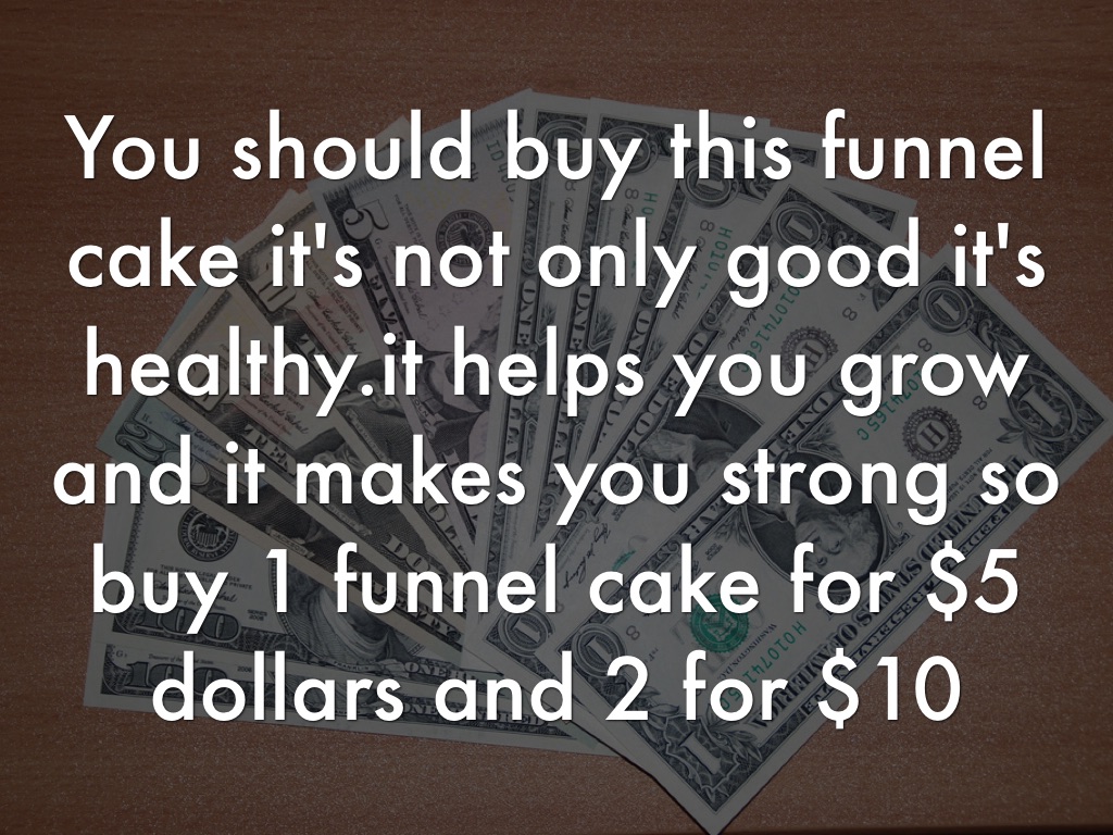 You should buy this funnel cake it's not only good it's healthy.it helps you grow and it makes you strong so buy 1 funnel cake for $5 dollars and 2 for $10