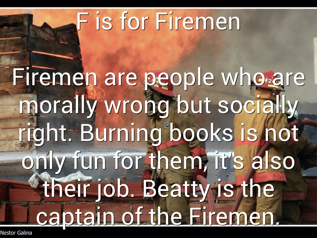 Firemen are people who are morally wrong but socially right. Burning books is not only fun for them, it's also their job. Beatty is the captain of the Firemen.