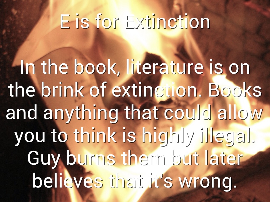 In the book, literature is on the brink of extinction. Books and anything that could allow you to think is highly illegal. Guy burns them but later believes that it's wrong.