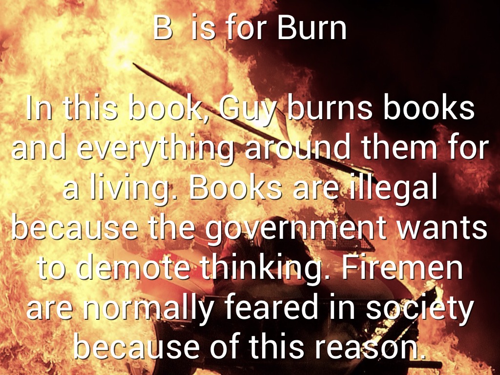 In this book, Guy burns books and everything around them for a living. Books are illegal because the government wants to demote thinking. Firemen are normally feared in society because of this reason.