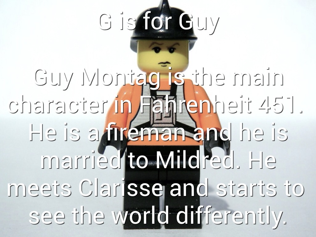 Guy Montag is the main character in Fahrenheit 451. He is a fireman and he is married to Mildred. He meets Clarisse and starts to see the world differently.
