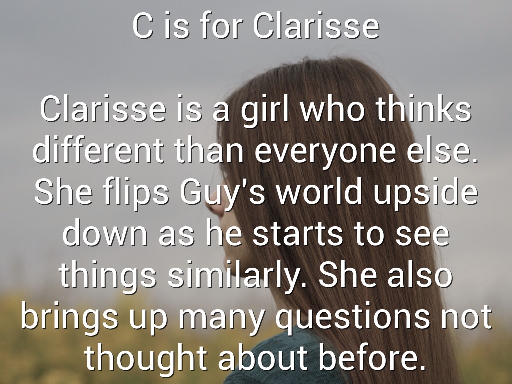 Clarisse is a girl who thinks different than everyone else. She flips Guy's world upside down as he starts to see things similarly. She also brings up many questions not thought about before.