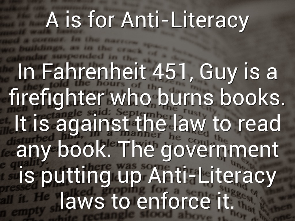 In Fahrenheit 451, Guy is a firefighter who burns books. It is against the law to read any book. The government is putting up Anti-Literacy laws to enforce it.