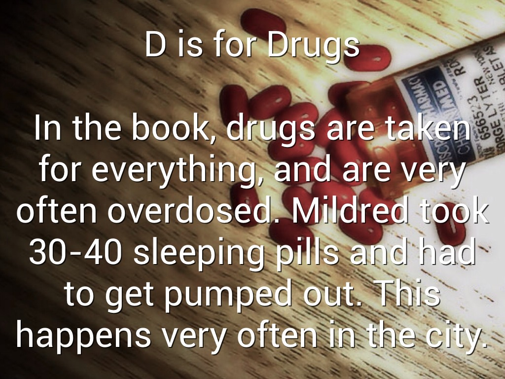 In the book, drugs are taken for everything, and are very often overdosed. Mildred took 30-40 sleeping pills and had to get pumped out. This happens very often in the city.