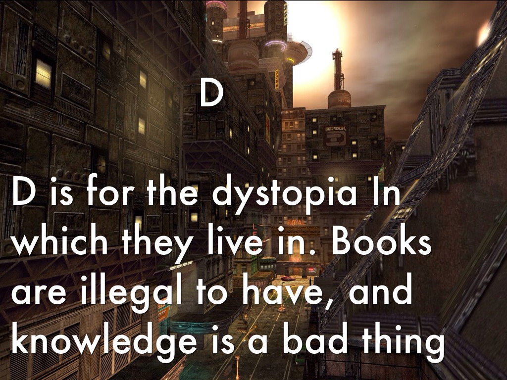 D is for the dystopia In which they live in. Books are illegal to have, and knowledge is a bad thing