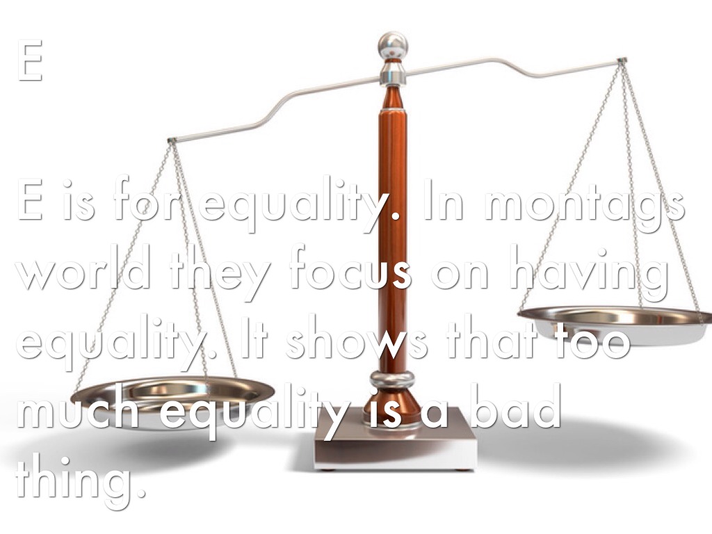 E is for equality. In montags world they focus on having equality. It shows that too much equality is a bad thing.