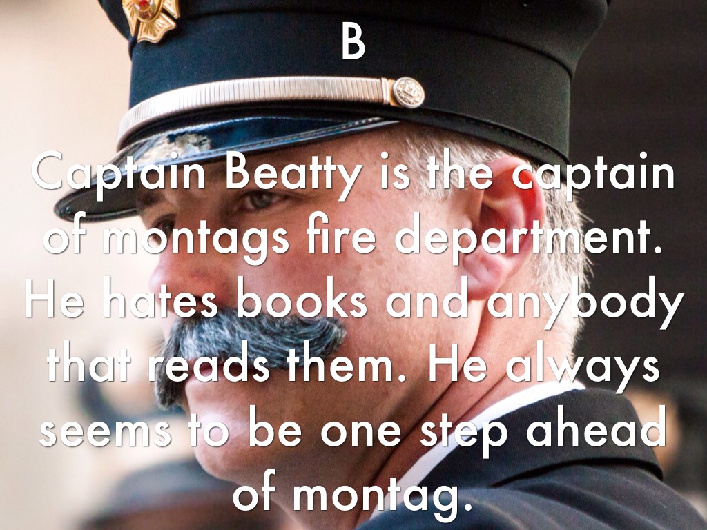 Captain Beatty is the captain of montags fire department. He hates books and anybody that reads them. He always seems to be one step ahead of montag.