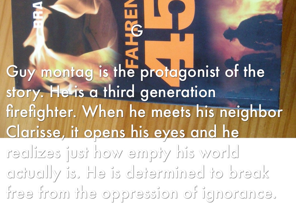 Guy montag is the protagonist of the story. He is a third generation firefighter. When he meets his neighbor Clarisse, it opens his eyes and he realizes just how empty his world actually is. He is determined to break free from the oppression of ignorance.