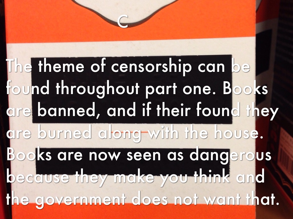 The theme of censorship can be found throughout part one. Books are banned, and if their found they are burned along with the house. Books are now seen as dangerous because they make you think and the government does not want that.