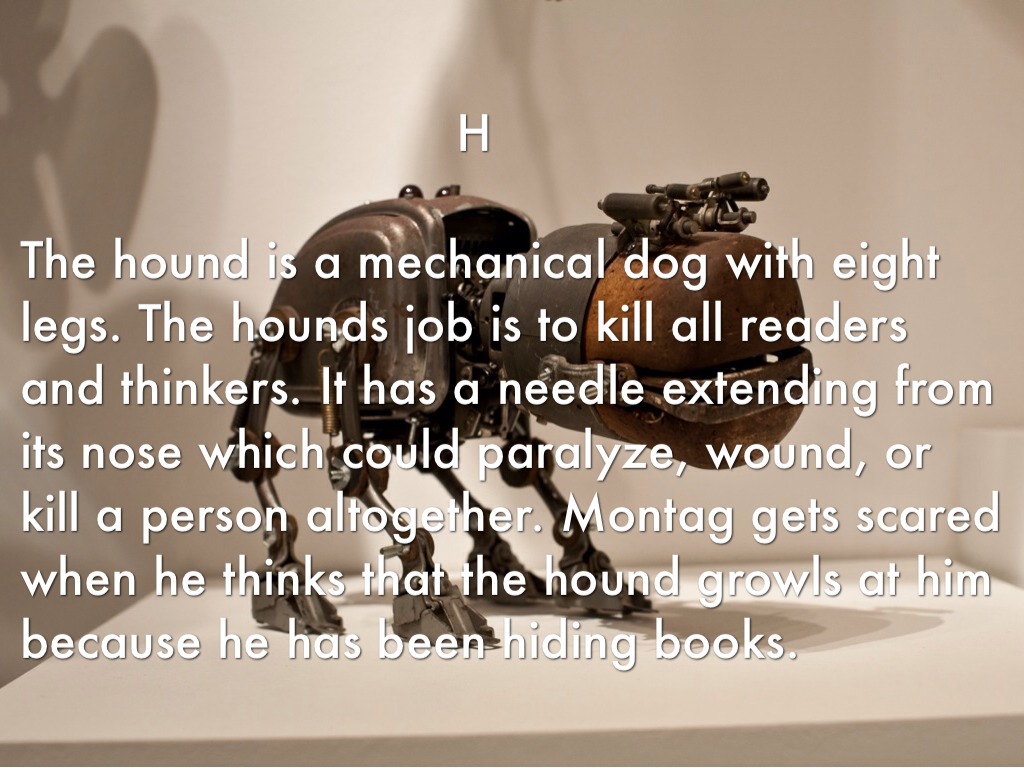 The hound is a mechanical dog with eight legs. The hounds job is to kill all readers and thinkers. It has a needle extending from its nose which could paralyze, wound, or kill a person altogether. Montag gets scared when he thinks that the hound growls at him because he has been hiding books.