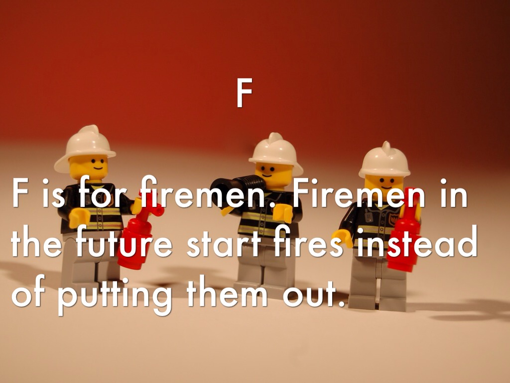 F is for firemen. Firemen in the future start fires instead of putting them out.