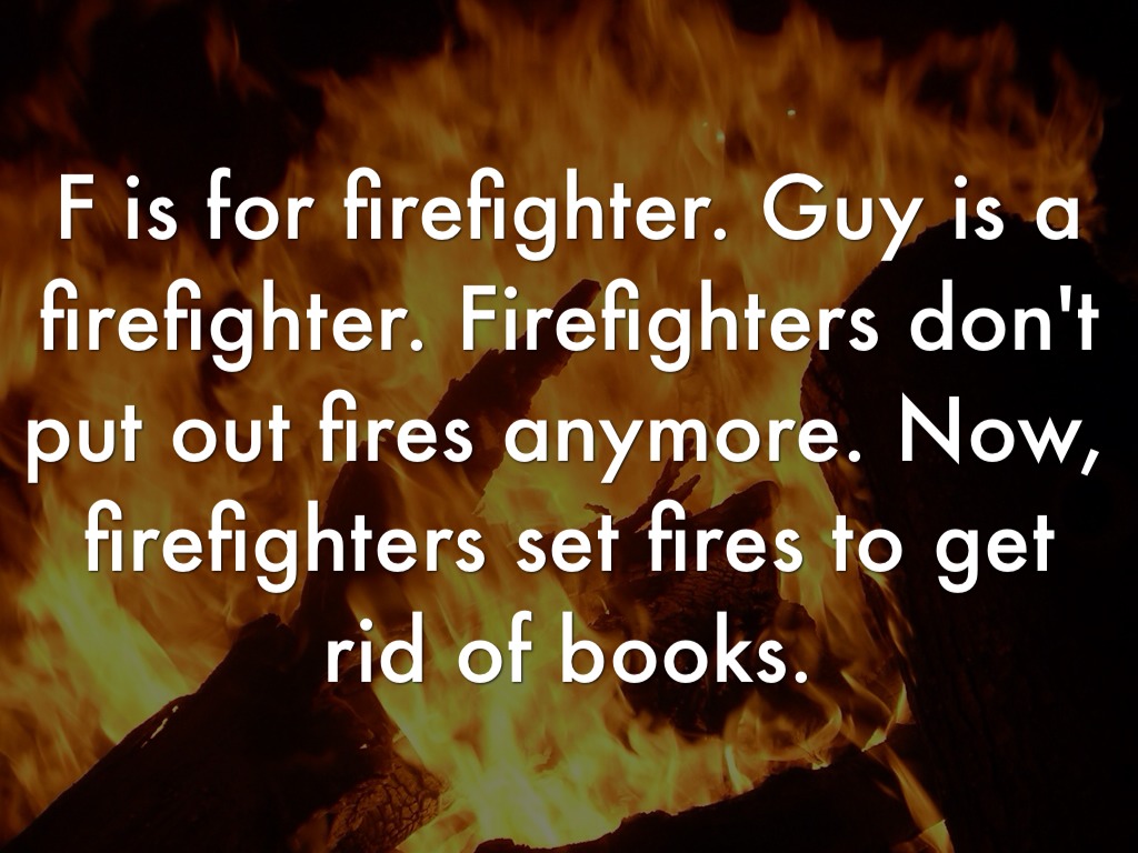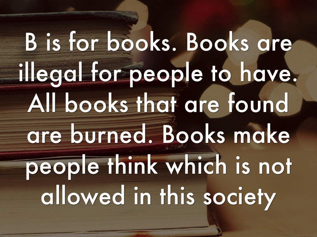 B is for books. Books are illegal for people to have. All books that are found are burned. Books make people think which is not allowed in this society