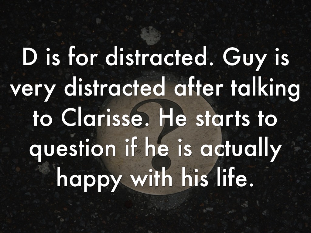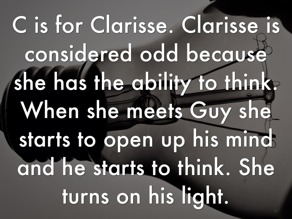 C is for Clarisse. Clarisse is considered odd because she has the ability to think. When she meets Guy she starts to open up his mind and he starts to think. She turns on his light.