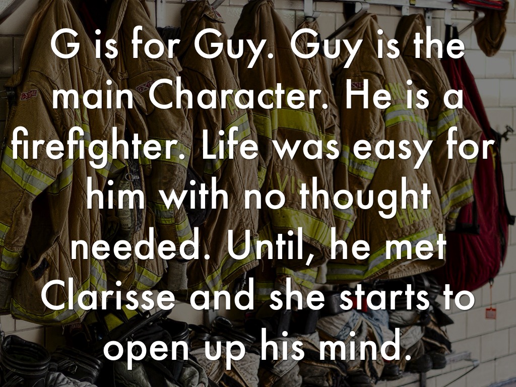 G is for Guy. Guy is the main Character. He is a firefighter. Life was easy for him with no thought needed. Until, he met Clarisse and she starts to open up his mind.