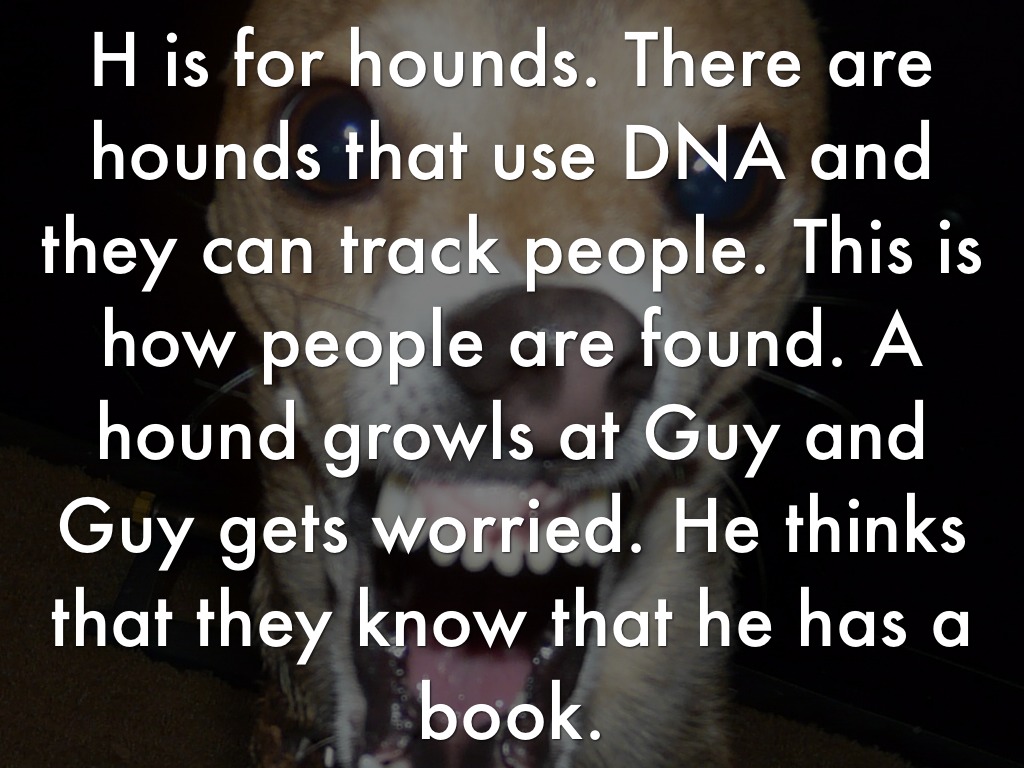 H is for hounds. There are hounds that use DNA and they can track people. This is how people are found. A hound growls at Guy and Guy gets worried. He thinks that they know that he has a book.