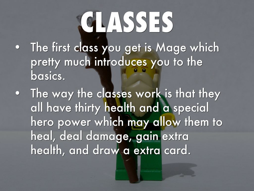 The way the classes work is that they all have thirty health and a special hero power which may allow them to heal, deal damage, gain extra health, and draw a extra card.