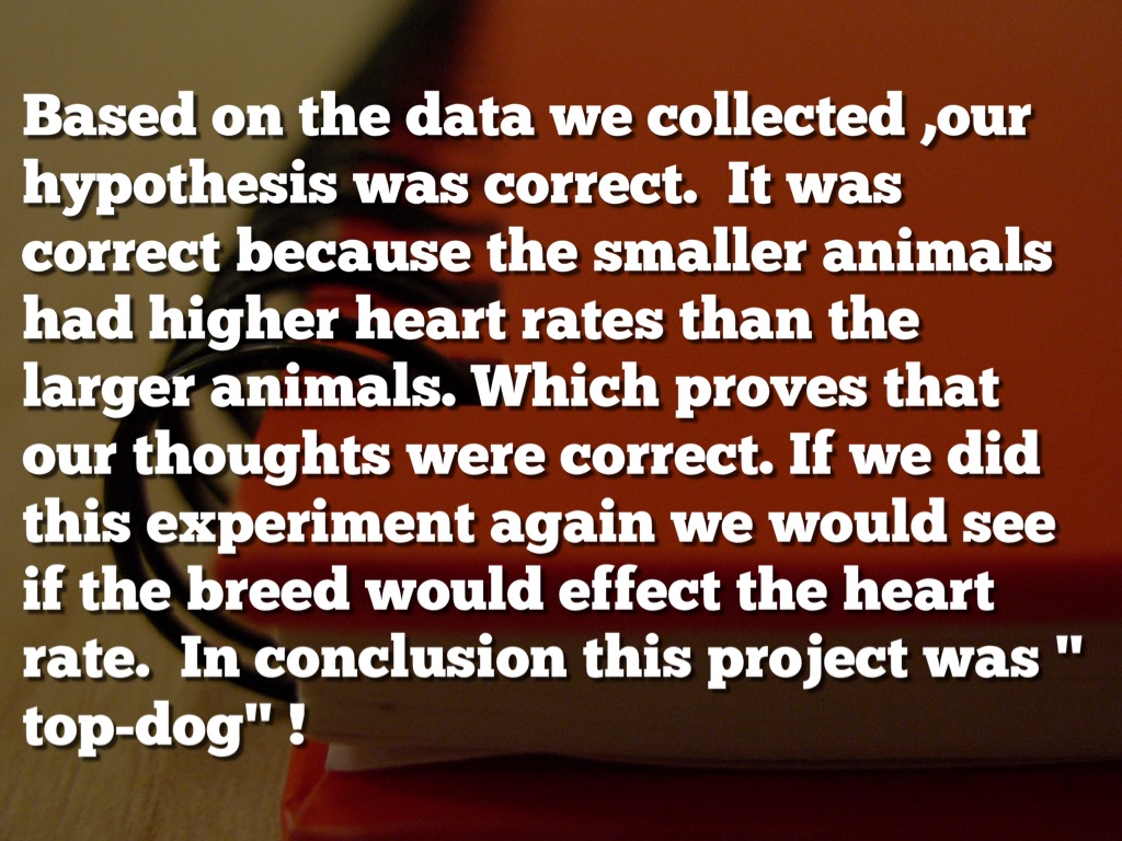 Based on the data we collected ,our hypothesis was correct. It was correct because the smaller animals had higher heart rates than the larger animals. Which proves that our thoughts were correct. If we did this experiment again we would see if the breed would effect the heart rate. In conclusion this project was " top-dog" !