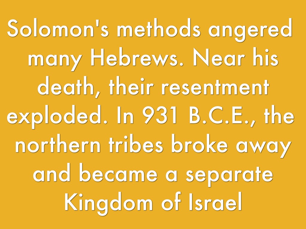 Solomon's methods angered many Hebrews. Near his death, their resentment exploded. In 931 B.C.E., the northern tribes broke away and became a separate Kingdom of Israel
