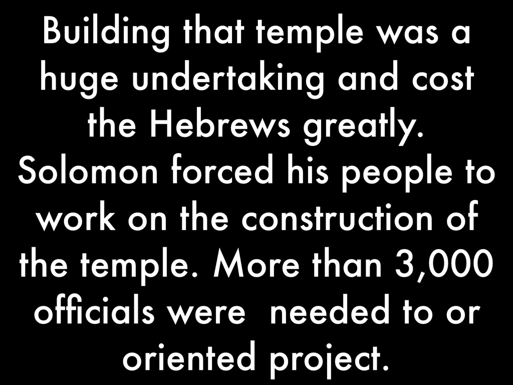 Building that temple was a huge undertaking and cost the Hebrews greatly. Solomon forced his people to work on the construction of the temple. More than 3,000 officials were needed to or oriented project.