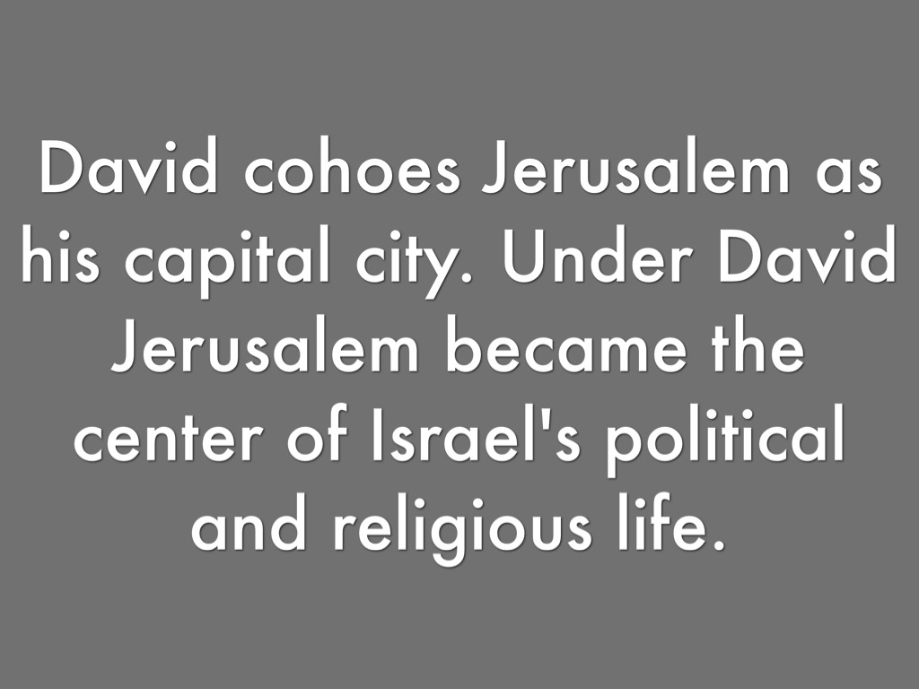 David cohoes Jerusalem as his capital city. Under David Jerusalem became the center of Israel's political and religious life.