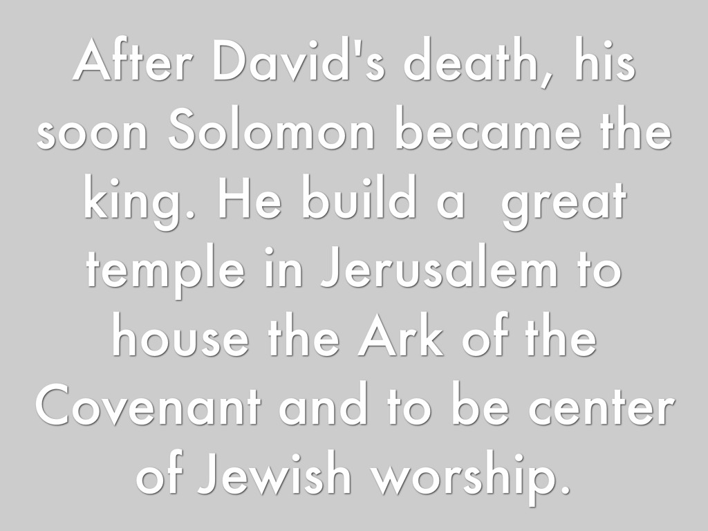 After David's death, his soon Solomon became the king. He build a great temple in Jerusalem to house the Ark of the Covenant and to be center of Jewish worship.
