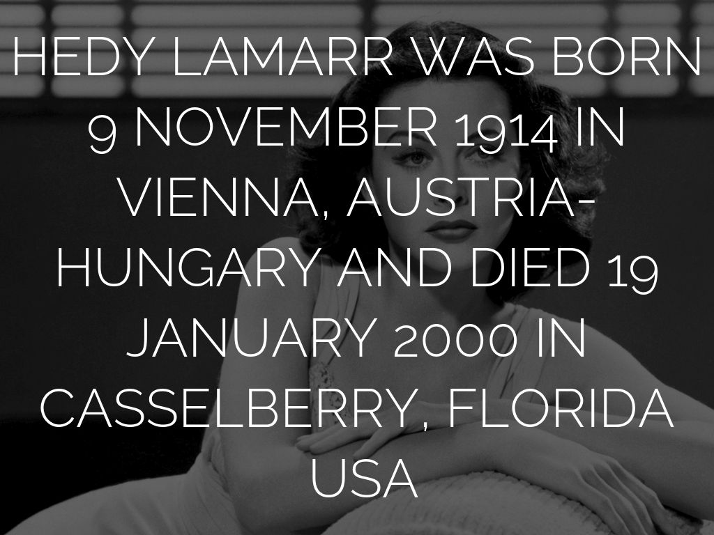 HEDY LAMARR WAS BORN 9 NOVEMBER 1914 IN VIENNA, AUSTRIA-HUNGARY AND DIED 19 JANUARY 2000 IN CASSELBERRY, FLORIDA USA