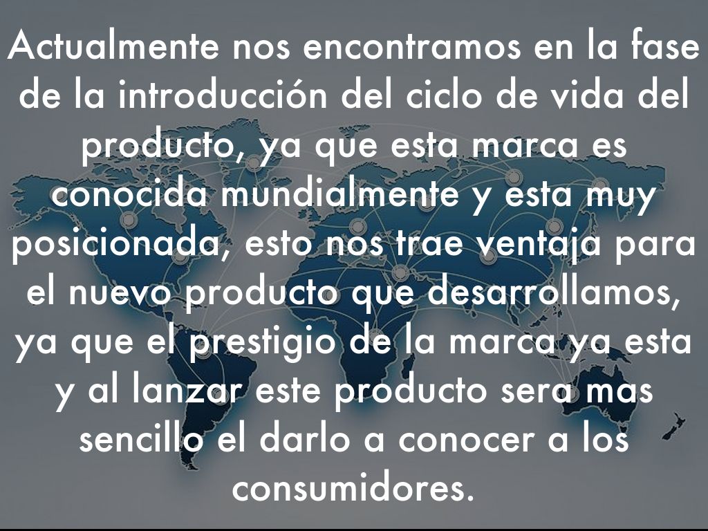 Actualmente nos encontramos en la fase de la introducción del ciclo de vida del producto, ya que esta marca es conocida mundialmente y esta muy posicionada, esto nos trae ventaja para el nuevo producto que desarrollamos, ya que el prestigio de la marca ya esta y al lanzar este producto sera mas sencillo el darlo a conocer a los consumidores.