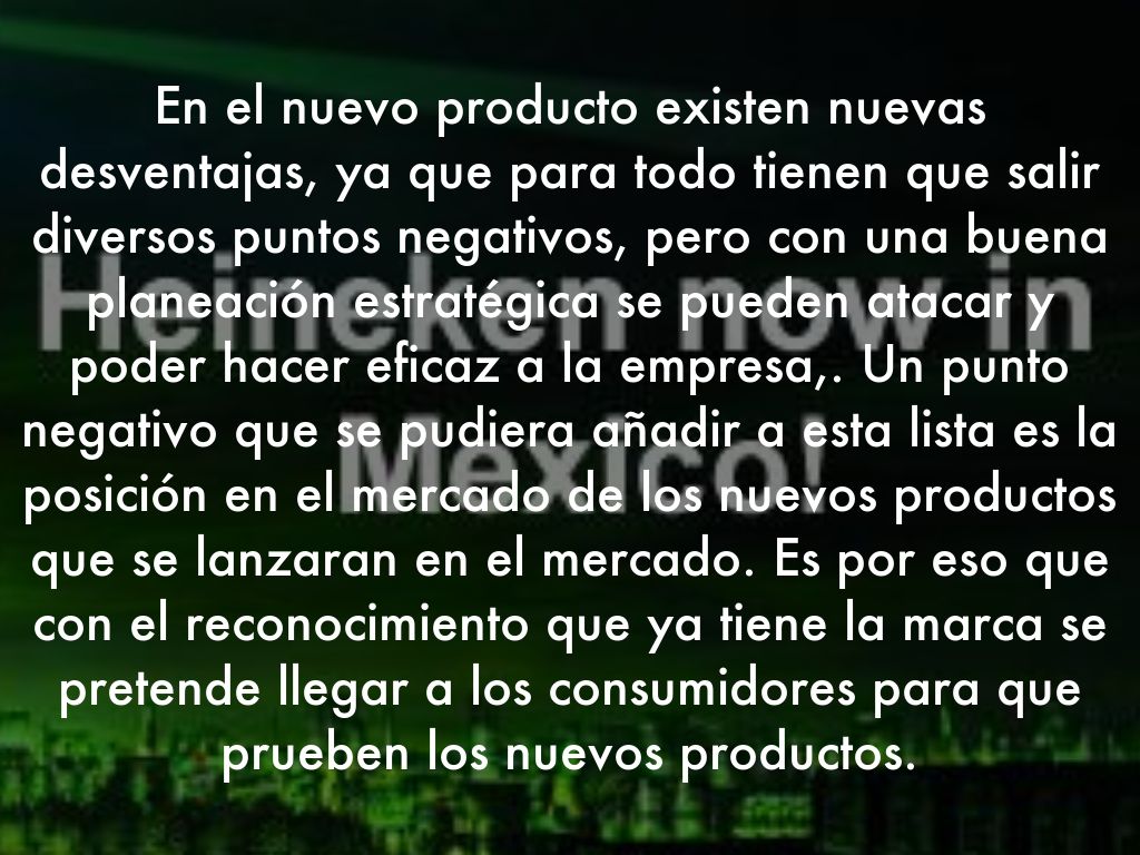 En el nuevo producto existen nuevas desventajas, ya que para todo tienen que salir diversos puntos negativos, pero con una buena planeación estratégica se pueden atacar y poder hacer eficaz a la empresa,. Un punto negativo que se pudiera añadir a esta lista es la posición en el mercado de los nuevos productos que se lanzaran en el mercado. Es por eso que con el reconocimiento que ya tiene la marca se pretende llegar a los consumidores para que prueben los nuevos productos.