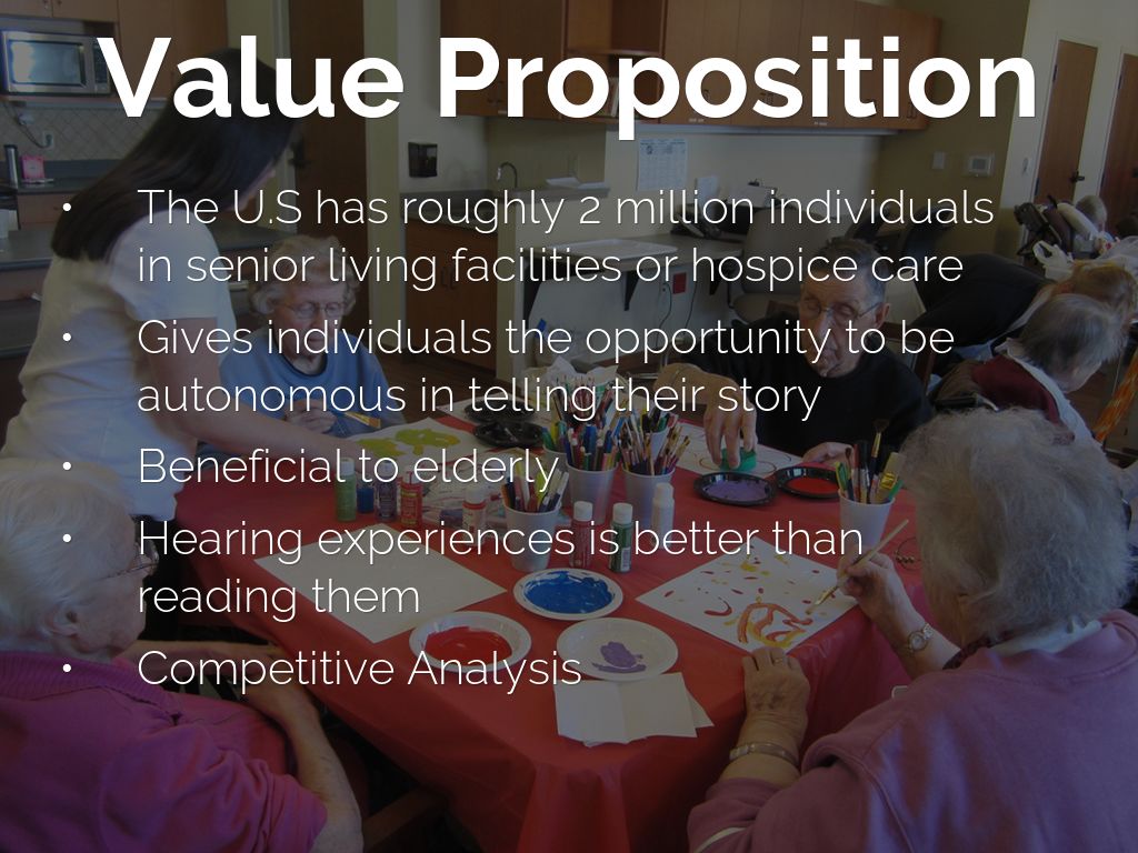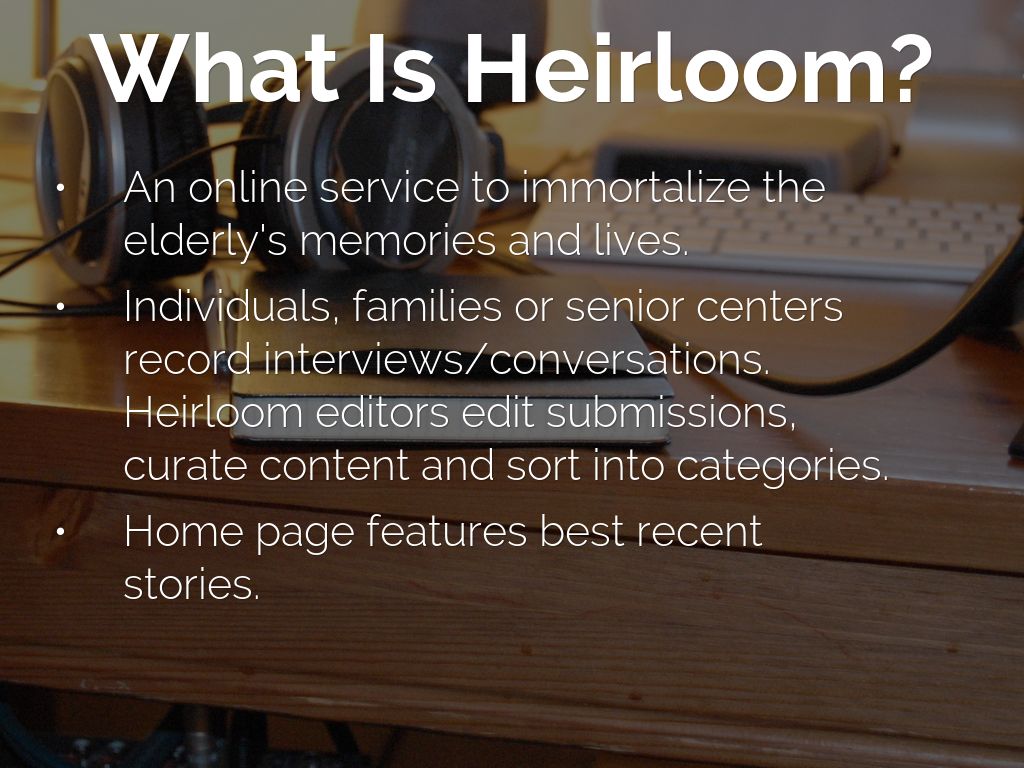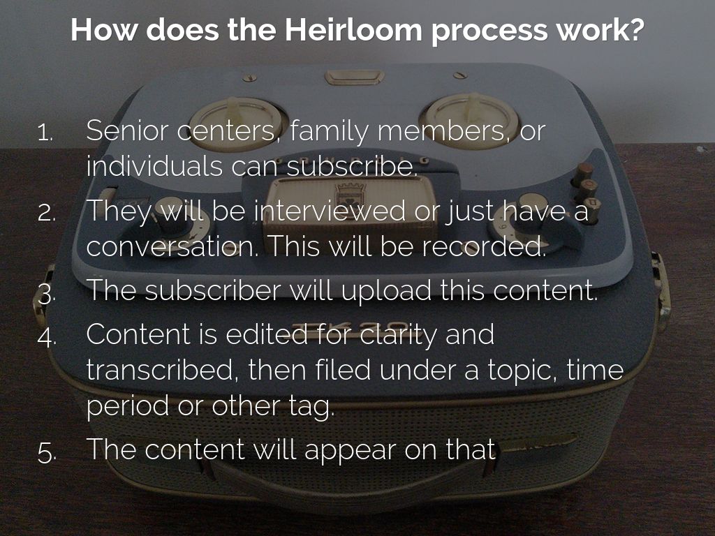 - Individuals, families or senior centers record interviews/conversations. Heirloom editors edit submissions, curate content and sort into categories.