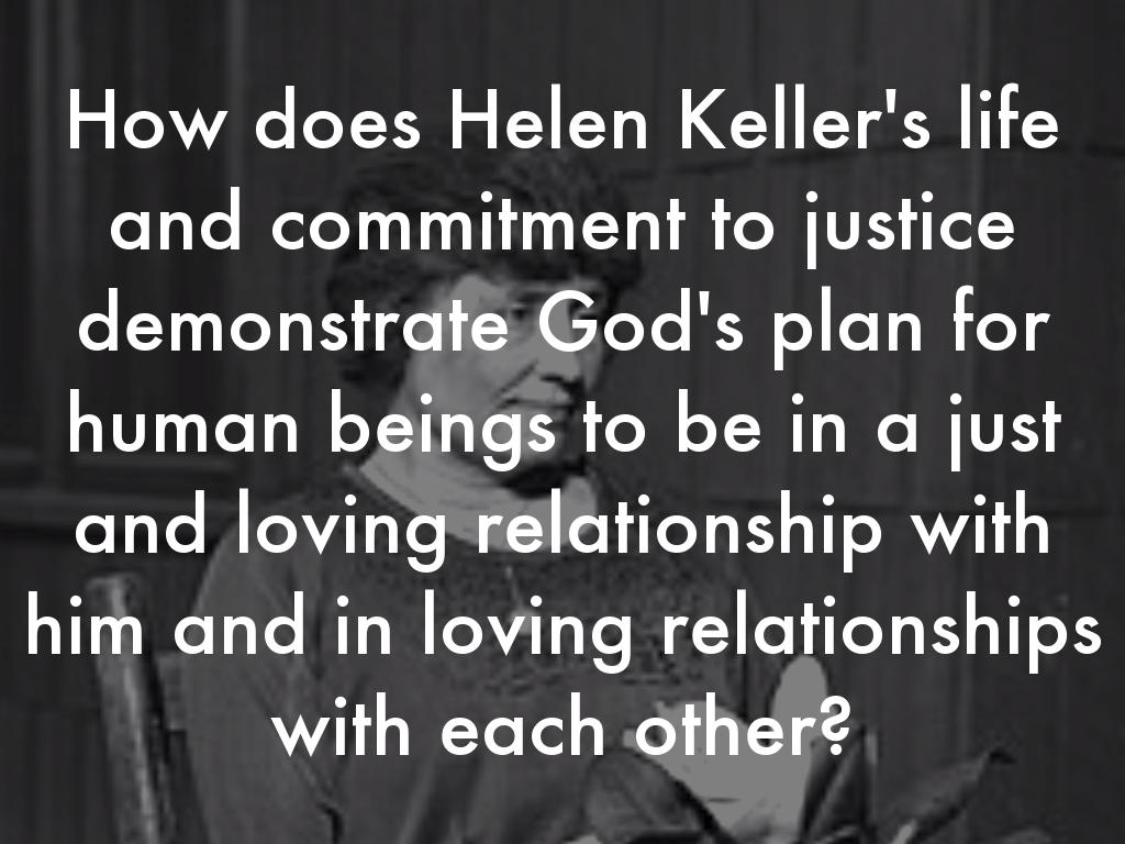 How does Helen Keller's life and commitment to justice demonstrate God's plan for human beings to be in a just and loving relationship with him and in loving relationships with each other?