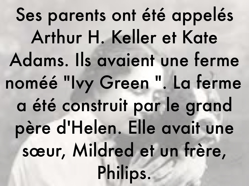 Ses parents ont été appelés Arthur H. Keller et Kate Adams. Ils avaient une ferme noméé "Ivy Green ". La ferme a été construit par le grand père d'Helen. Elle avait une sœur, Mildred et un frère, Philips.