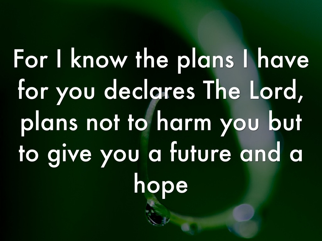 For I know the plans I have for you declares The Lord, plans not to harm you but to give you a future and a hope