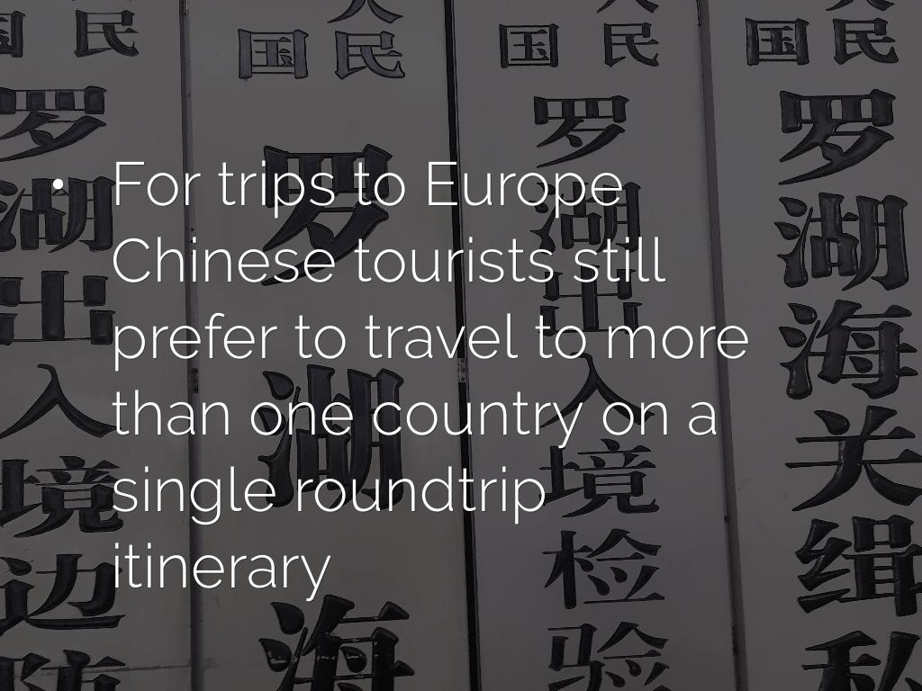 - For trips to Europe Chinese tourists still prefer to travel to more than one country on a single roundtrip